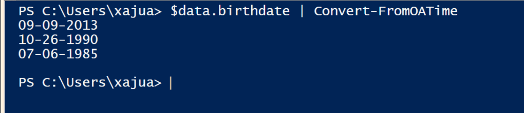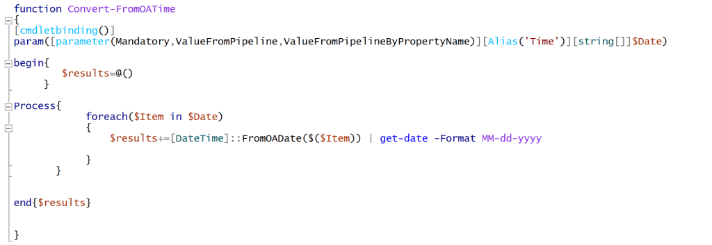 $data=@() $data+=New-Object psobject -Property @{name="Xajuan"; Age="" ; Birthdate=41526} $data+=New-Object psobject -Property @{name="Tyesha"; Age="" ; Birthdate=33172} $data+=New-Object psobject -Property @{name="Xajuan"; Age="" ; Birthdate=31234} function Convert-FromOATime { <# .Synopsis Coverting OA time to regular time. .DESCRIPTION A proof of concept blending programming knowledge and scripting. .EXAMPLE $data.birthdate | Convert-FromOATime .EXAMPLE $data | select name,@{name='age';e={(get-date -format yyyy) -($($_.birthdate|Convert-FromOATime|get-date -format yyyy))}},@{name='birthdate';e={$_.birthdate|Convert-FromOATime}} .NOTES By Xajuan Smith PowerShell.city #> [cmdletbinding()] param([parameter(Mandatory,ValueFromPipeline,ValueFromPipelineByPropertyName)][Alias('Time')][string[]]$Date) begin{ $results=@() } Process{ foreach($Item in $Date) { $results+=[DateTime]::FromOADate($($Item)) | get-date -Format MM-dd-yyyy } } end{$results} }#end Function #example $data | select name,@{name='age';e={(get-date -format yyyy) -($($_.birthdate|Convert-FromOATime|get-date -format yyyy))}},@{name='birthdate';e={$_.birthdate|Convert-FromOATime}}